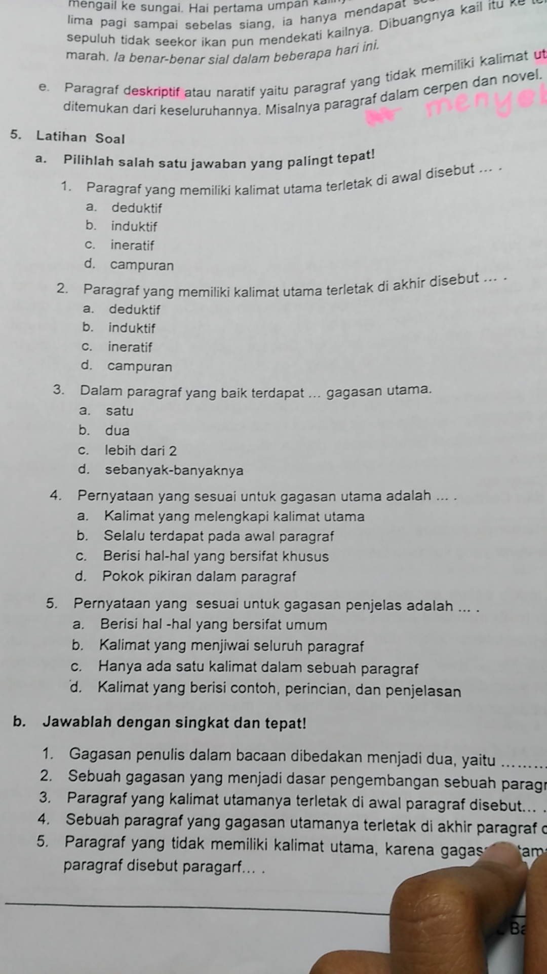 Kalimat yang di dalamnya terdapat ide pokok paragraf disebut dengan kalimat. Ide pokok juga sering dinamakan sebagai gagasan utama, gagasan pokok, atau pikiran utama. Sebuah paragraf yang baik memiliki ide pokok . Ide utama dalam sebuah paragraf disebut ide pokok atau pokok pikiran paragraf atau gagasan utama. Ide pokok atau gagasan utama adalah sebuah topik yang akan dibahas di dalam sebuah paragraf. Lalu, di mana ide pokok . Dalam pelajaran bahasa indonesia, ide pokok juga disebut sebagai gagasan pokok, pikiran utama dalam sebuah paragraf. Jelaskan cara menentukan gagasan utama/ ide pokok pada suatu paragraf ! Oleh penulis menjadi suatu pokok pembahasan dalam sebuah paragraf. E3radg8 dan 1272 orang menganggap jawaban . Suatu gagasan (ide) yang sedang dibicarakan atau dibahas dalam sebuah paragraf dinamakan ide pokok. Jenis paragraf berdasar letak kalimat utama terbagi mennjadi 4 yakni deduktif, induktif,. Ide pokok atau gagasan utama adalah sebuah topik yang akan dibahas di dalam sebuah paragraf.